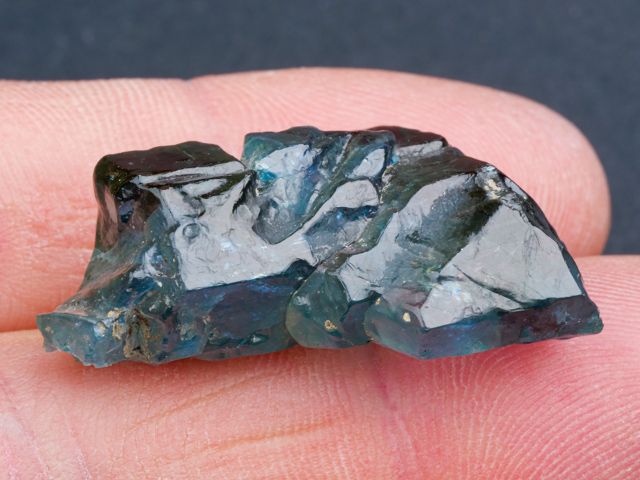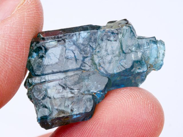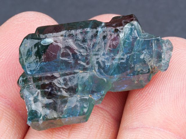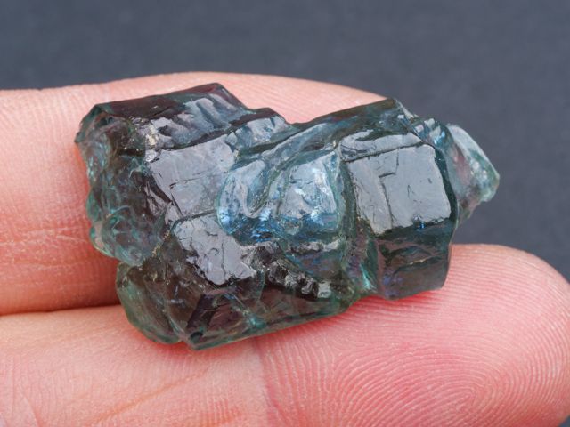 Samostatný ukončený krystal zelenomodrého apatitu z klasické ruské lokality. Krystal je lesklý a typicky "oleptaný". Množství těchto kamenů se rok od roku zmenšuje vzhledem k situaci v místě těžby. 3,3 cm velký kámen s takovouto čistotou je již velice těžce dostupný. V polarizovaném světle má úžasnou barvoměnu. Na denním světle má typickou žlutozelenou barvu.