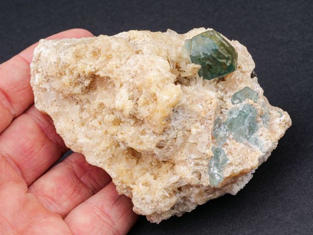 Fantastický vzorek krystalu apatitu o velikosti 1,9 cm na kalcitové podložce.