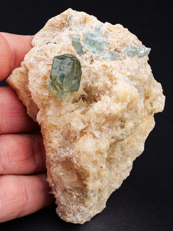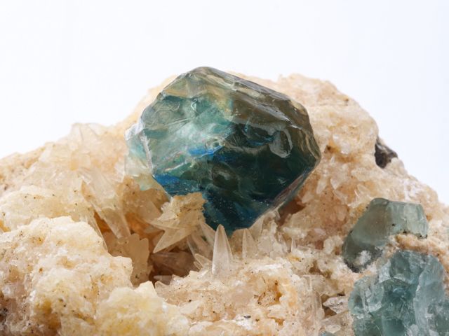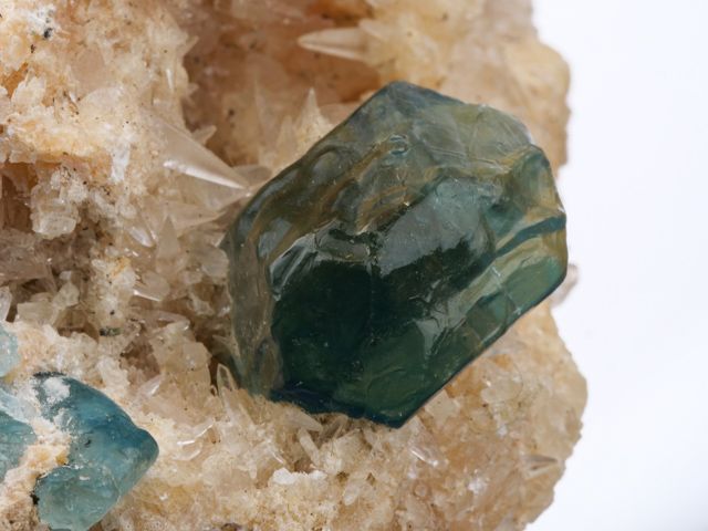 Fantastický vzorek krystalu apatitu o velikosti 1,9 cm na kalcitové podložce. Krystal je velice čistý, ukončený, lesklý a typicky oleptaný. Na drúze je i několik velmi pěkných ostrých krystalů kalcitu. V současnosti se jedná o poměrně vzácný materiál z tradiční, ale dotěžené, ruské lokality Sludjanka. Vysoce estetický vzorek.