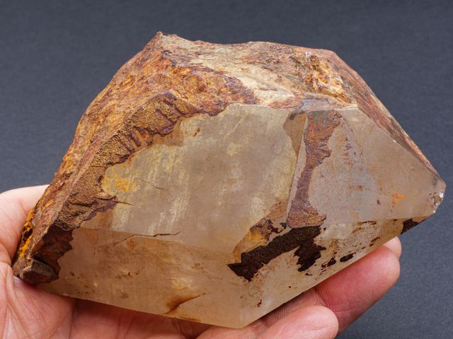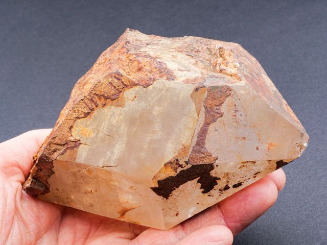 Zajímavá ukázka křišťálu se zajímavým oranžovým povlakem z lokality Perekatnoe.