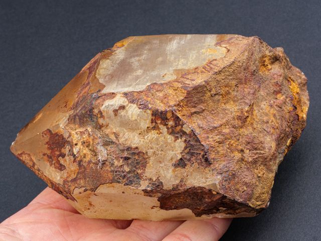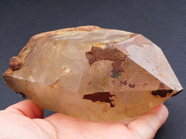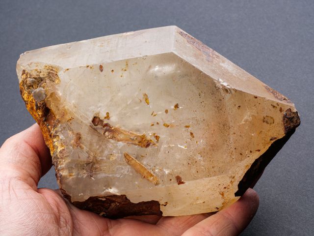 Zajímavá ukázka křišťálu se zajímavým oranžovým povlakem z lokality Perekatnoe. Velmi dobrý stav - jen minimum nějakých oděrek - největší v klencové ploše 6x4 mm a ve špičce 4x4 mm. Luxusní lokalitní ukázka z Ruska.