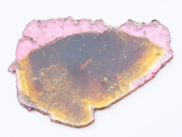Barevně jedinečný řez ruským turmalínem (liddicoatitem). Liddiocoatity jako je tento jsou světoznámě proslulé a vzhledem k jejich extravagantní barevnosti jsou využívány do jedinečných šperků. Placička může být i kvalitním zástupcem tohoto minerálu ve Vaší sbírce. Řez je leštěn z obou stran.