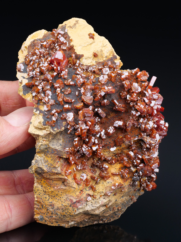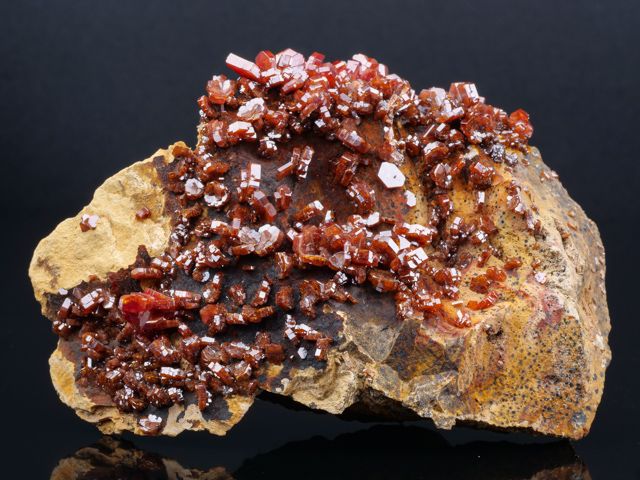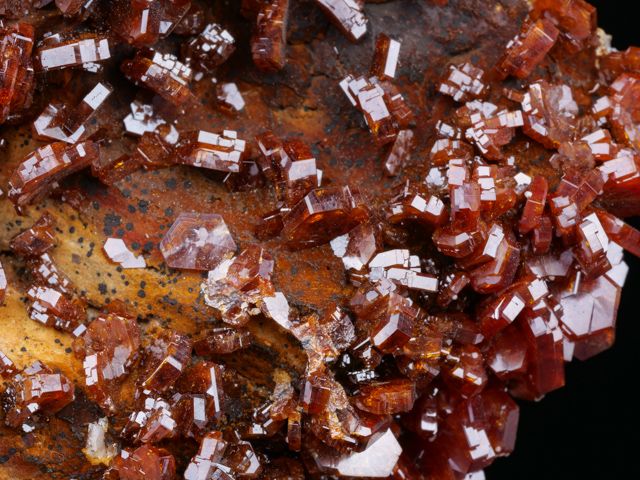 Vanadinit tvoří sytě červené, skelně až diamantově lesklé, částečně průsvitné, pěkně ohraničené, hexagonální krystaly dosahující velikosti až 8 mm.Vanadinit tvoří sytě červené, skelně až diamantově lesklé, částečně průsvitné, pěkně ohraničené, hexagonální krystaly dosahující velikosti až 8 mm. Super vzorek do sbírky!