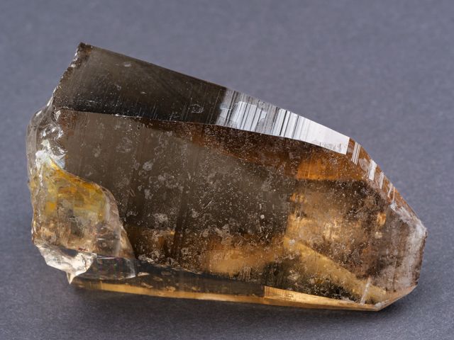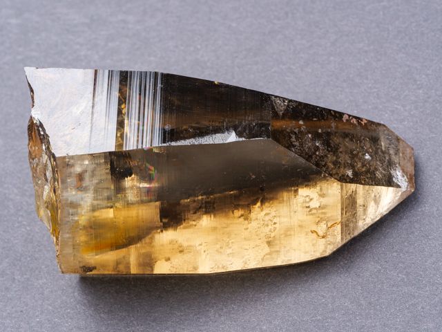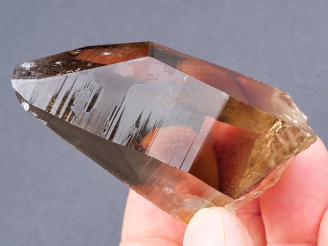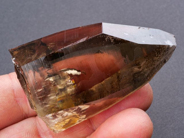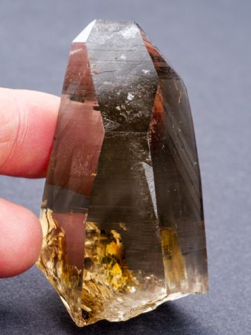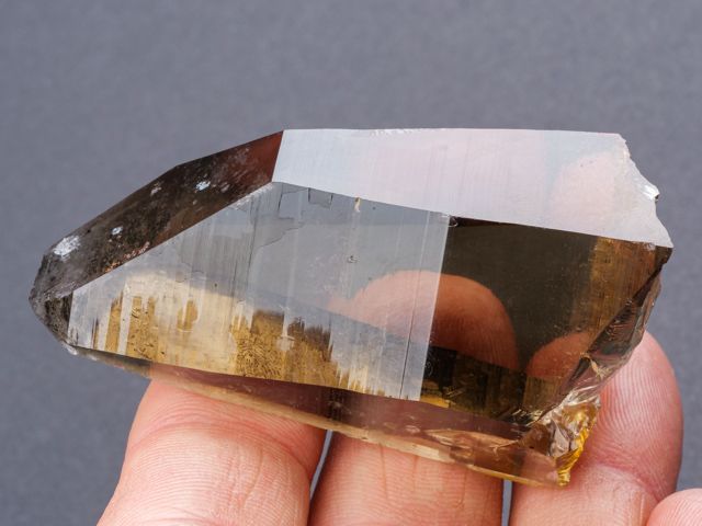 Zajímavý krystal přírodní záhnědy z ruské lokality Južnyj. Krystal je ukončený, lesklý a má přirozenou příjemně světle kouřovou barvu. Vysoká čistota dovoluje podobný materiál brousit - velká partie (99%) je drahokamová tzv. optický křemen - zde by to ale bylo velmi škoda jakkoliv s kamenem pracovat.
