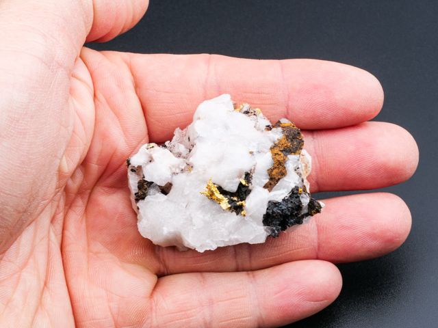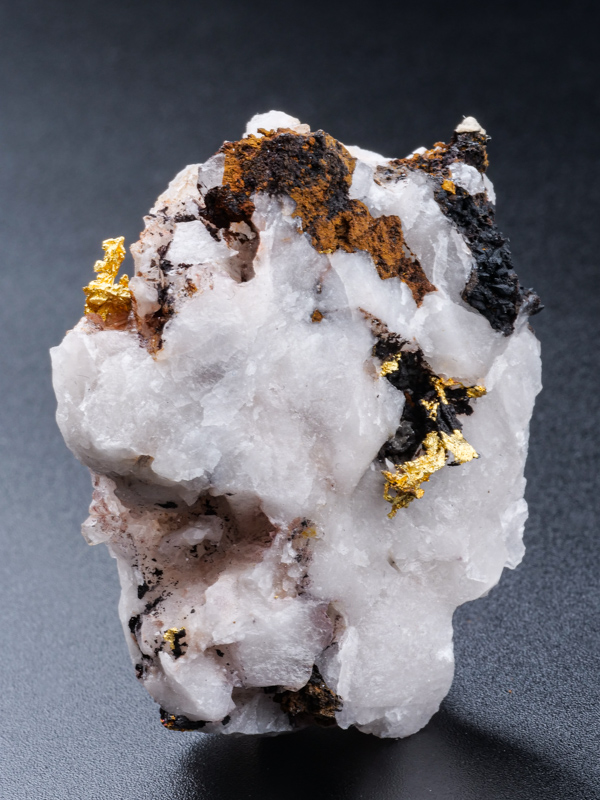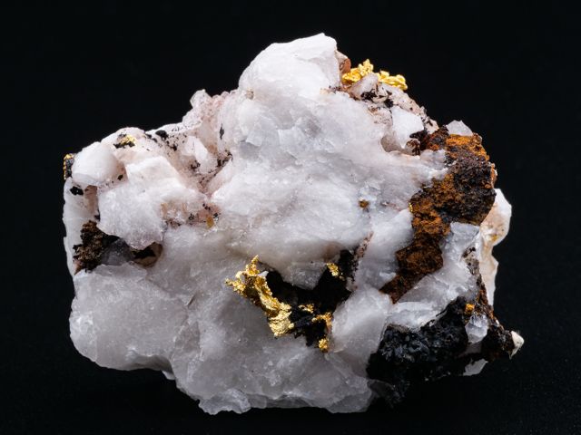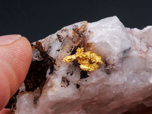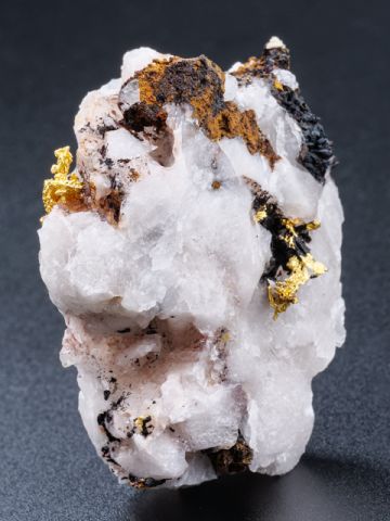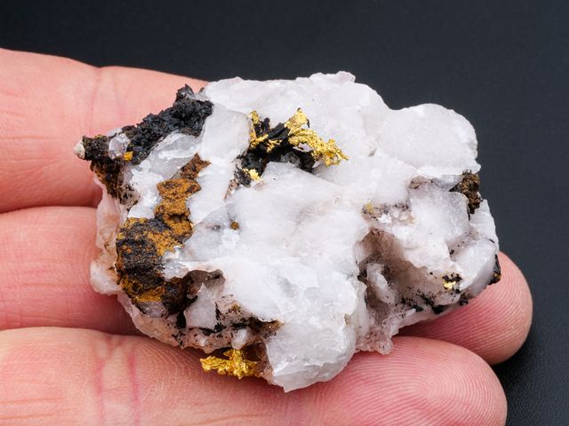Překrásný vzorek ryzího zlata na křemeni z nového nálezu na lokalitě Aouint Ighoman v Maroku.Překrásný vzorek ryzího zlata na křemeni z nového nálezu na lokalitě Aouint Ighoman v Maroku. Seskupení lesklých krystalů zlata trčí na dvou hlavních místech z křemene. Velice estetický vzorek s velkým obsahem zlata. Nová produkce není, tudíž se předpokládá růst cen těchto vzorků v budoucnu.