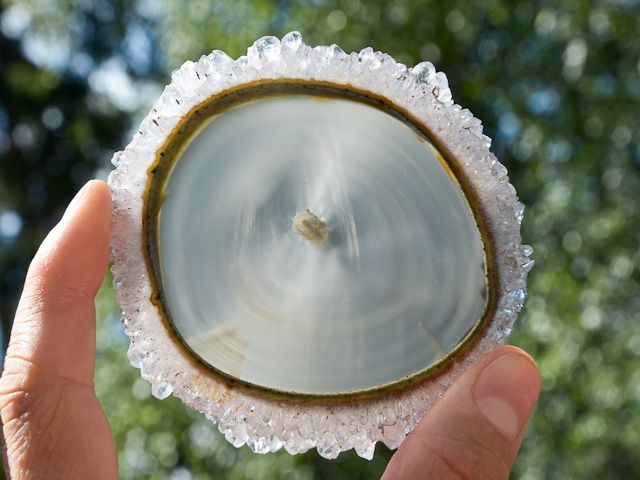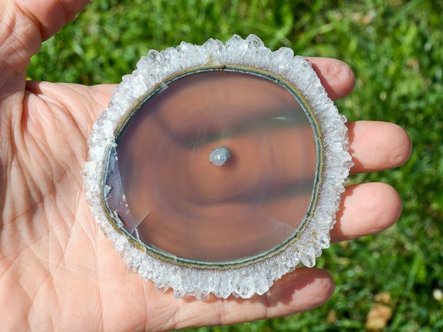 Řez ametystovým / achátovým krápníkem z Uruquaye. Jedná se o oboustranně leštěný plátek 6 mm tlustý. Krystaly po stranách jsou o velikosti do 8 mm.