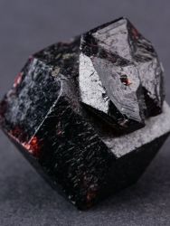 Estetická ukázka menšího, ale dokonalého krystalu almandinu z rakouských Alp. O co je krystal menší (na lokalitě se nacházejí i mnohem větší krystaly), o to je čistší (čistota daného vzorku je v rámci lokalitních poměrů silně nadprůměrná). Krystal sedí na menším plochém krystalu, který má kontakt od jiného krystalu.