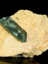 This glassy, translucent, pretty teal-blue apatite crystals set in contrasting, cream-colored calcite matrix are a Russian classic.This glassy, translucent, pretty teal-blue apatite crystals set in contrasting, lustrous, cream-colored calcite matrix are a Russian classic. The main crystal is 4,0 cm terminated and the apatite has a very distinctive melted look. Older and showy combination material.