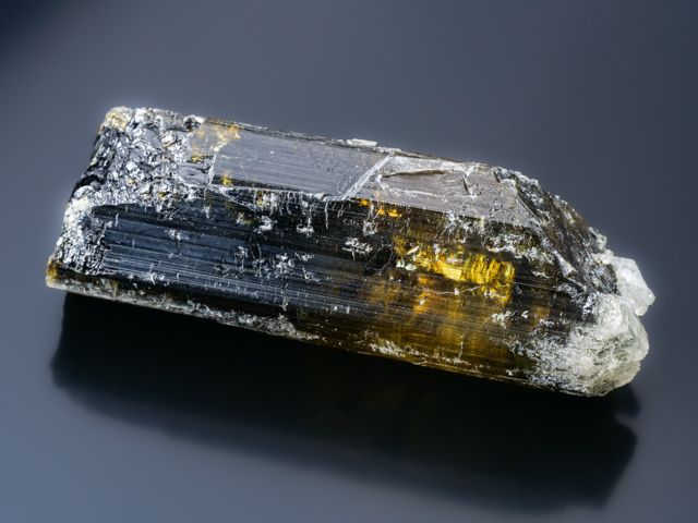 Velmi hezký krystal dravitu z Tanzánie. Ukončený krystal zelenohnědého turmalínu - dravitu. Hezky zonální - ukončení přechází téměř do bílé barvy. Bez prosvícení se jeví více tmavý než jak je zachyceno na fotkách z fotostudia.