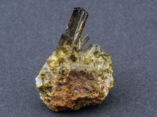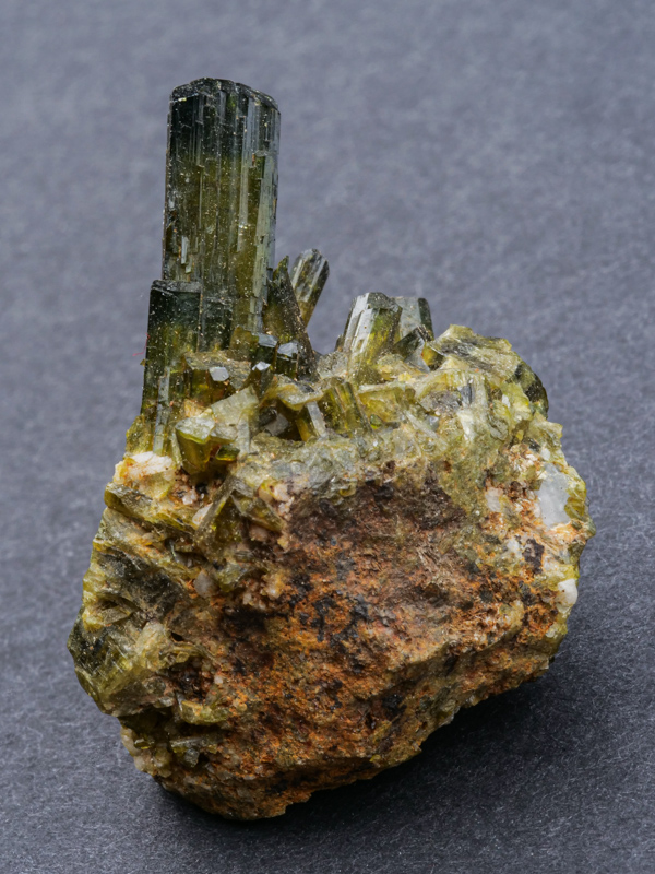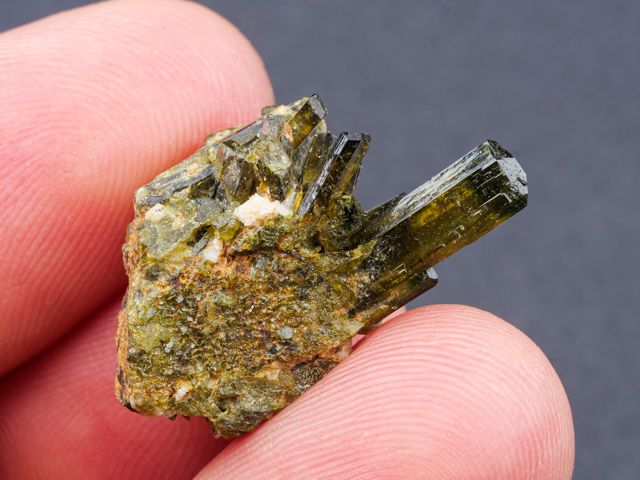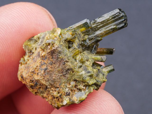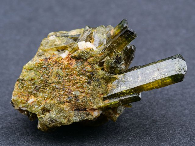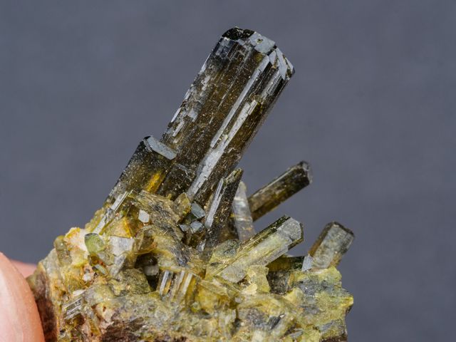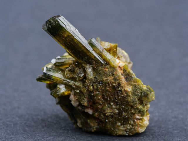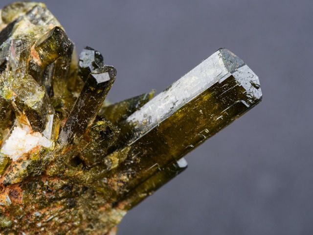 Srostlice ukončených krystalů epidotu z klasické lokality alpské parageneze Sobotín - Pfarrerb.Srostlice ukončených krystalů epidotu z klasické lokality alpské parageneze Sobotín - Pfarrerb. Krystaly jsou lesklé a při prosvícení sytě zelené. Hlavní krystal měří 12 mm.