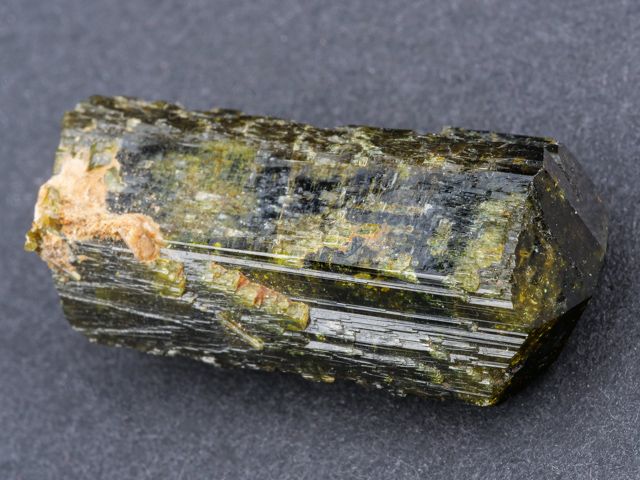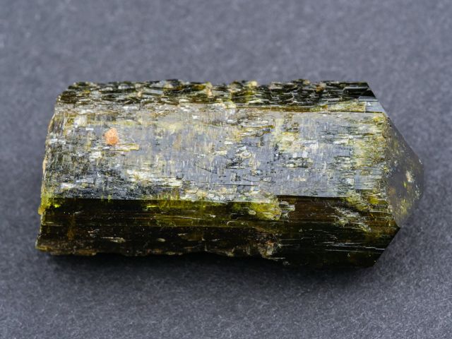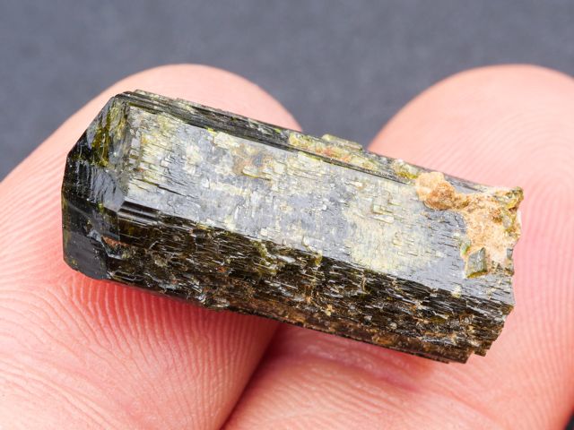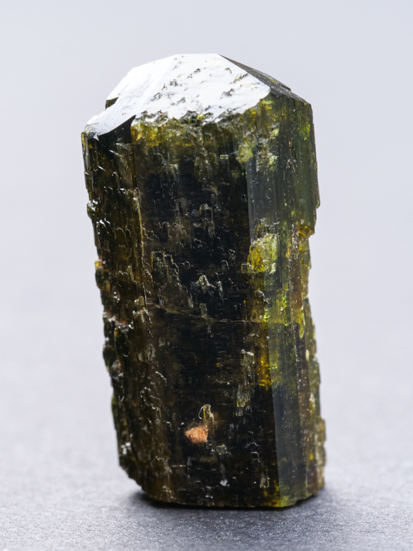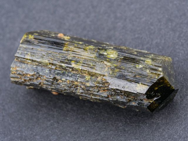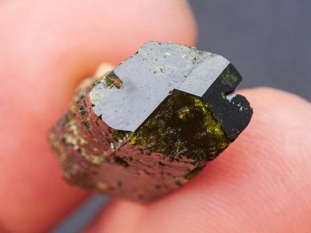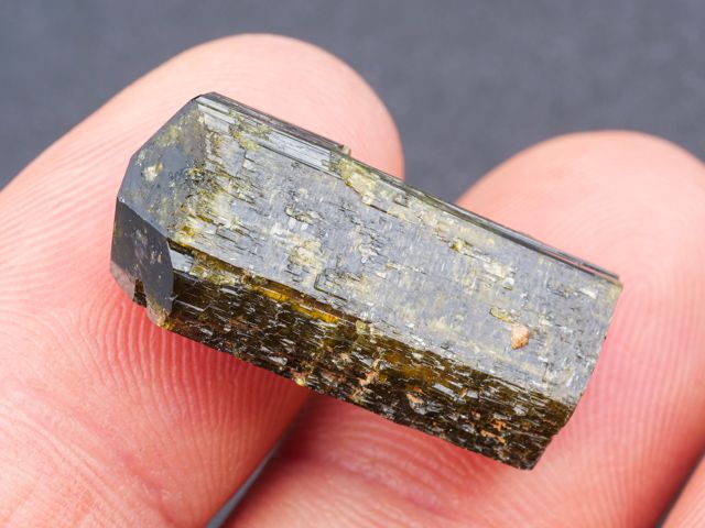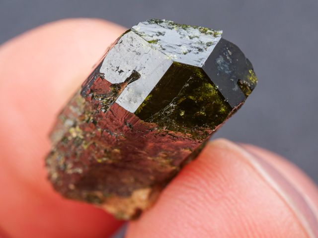 Hezká ukázka ukončeného krystalu epidotu z klasické lokality alpské parageneze Sobotín - Pfarrerb.Hezká ukázka ukončeného krystalu epidotu z klasické lokality alpské parageneze Sobotín - Pfarrerb. Krystal je lesklý a při prosvícení sytě zelený s hezkou zonálností.