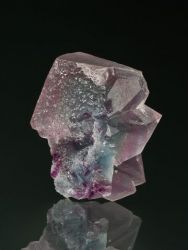 Srostlice jemně zelenofialových krystalů fluoritu - oktaedrů. Na zadní straně je drobná nárůstová ploška (vyhojená), jinak je vzorek na všech místech ukončen. Vzorek je matnější a až na jeden rožek největšího oktaedru se jedná o nepoškozený vzorek. Nejdelší hrana krystalu velikost 2,7 cm. Ve skutečnosti na denním světle je barva mírně sytější a více do zelena.