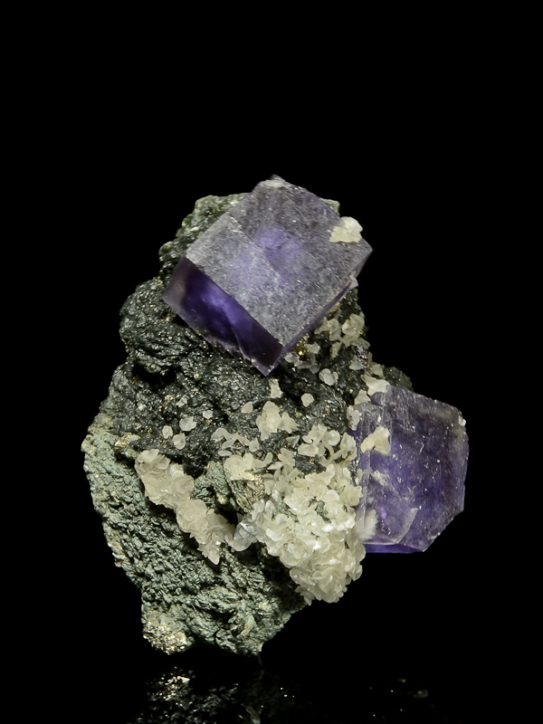 A wonderful new specimen, with gem blue cubic fluorite crystals to 13 mm on edge scattered over a black matrix.A wonderful new specimen, with gem blue cubic fluorite crystals to 13 mm on edge scattered over a black matrix. As seen in the photos, main crystal appears in good condition, except second crystal that is incomplete. Quite aesthetic and attractive!