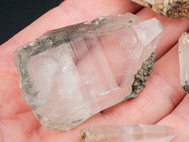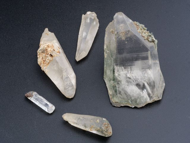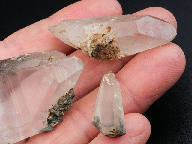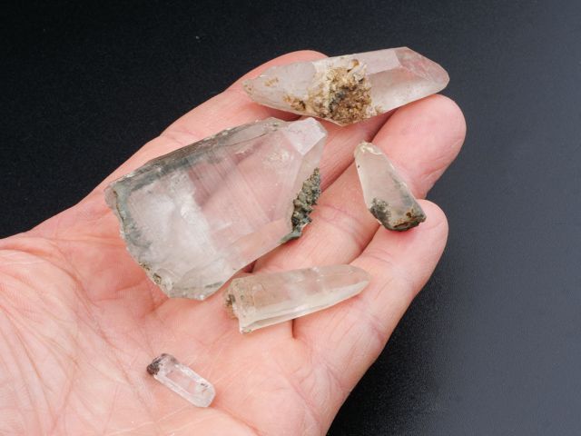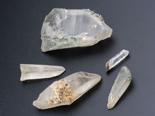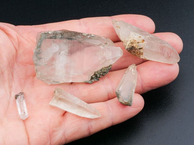 5 pcs of nice crystals with dark green chlorite inclusions from Krásné u Šumperka, Czech Republic.5 pcs of nice crystals with dark green chlorite inclusions from Krásné u Šumperka, Czech Republic. The crystal tips are transparent and clear. Crystals have some damages on the tips and edges.