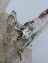 Velká drúza krystalů křemene. Vzorek má příjemnou šedohnědou barvu a vysoký lesk. Menší z krystalů mají vysokou čistotu. Poškození je v kontrastu velikosti vzorku minimální (jeden z menších krystalů byl odlomen v kontaktu se slídou). Těsně pod povrchem krystalů jsou drobné inkluze červeného blíže neurčeného minerálu.