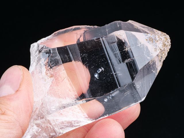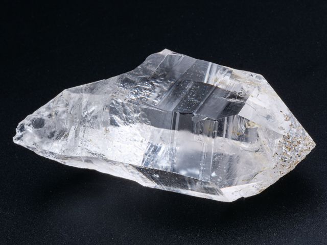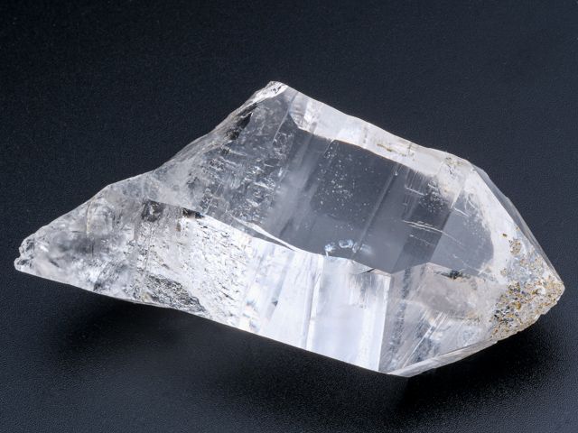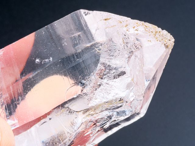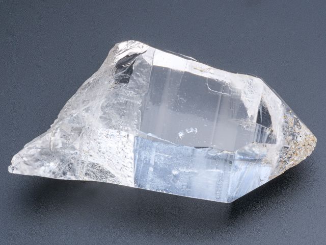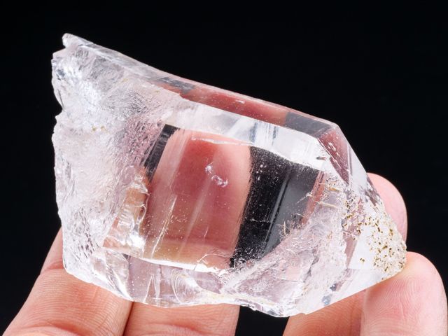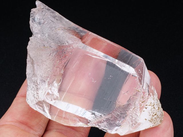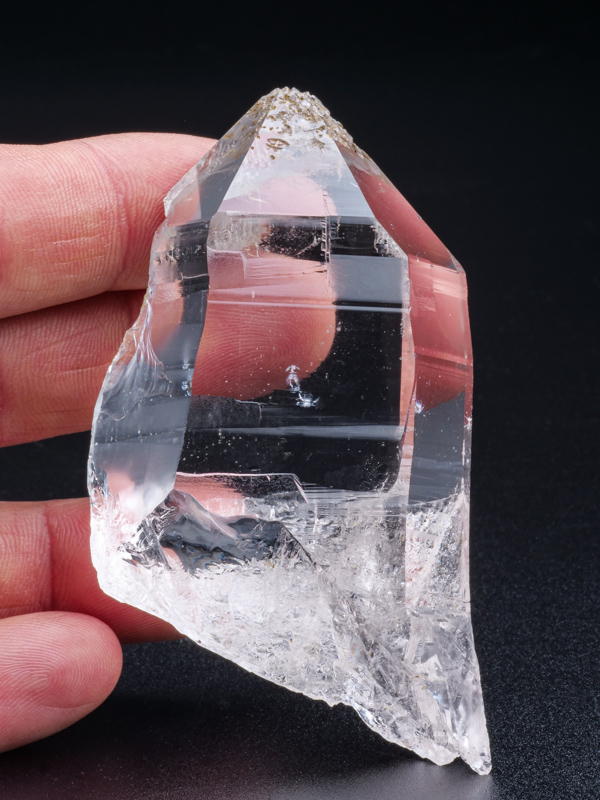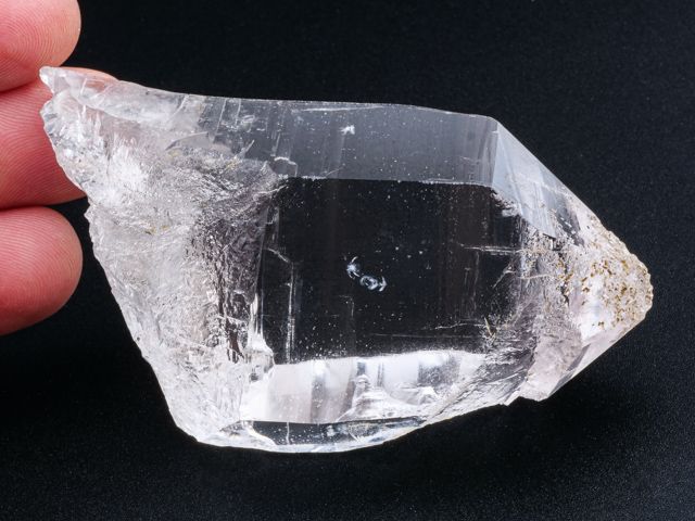 Velmi čistý krystal křišťálu z Afriky. Čistota a vysoký lesk jsou to co dělají tento vzorek zajímavým. Ukončený krystal má drobná poškození na hranách prizmatu (největší 20x10 mm). V kontrastu velikosti a kvality je tento vzorek velmi zajímavý i přes toto poškození a cena je díky tomu upravena a snížena na cenu suroviny.