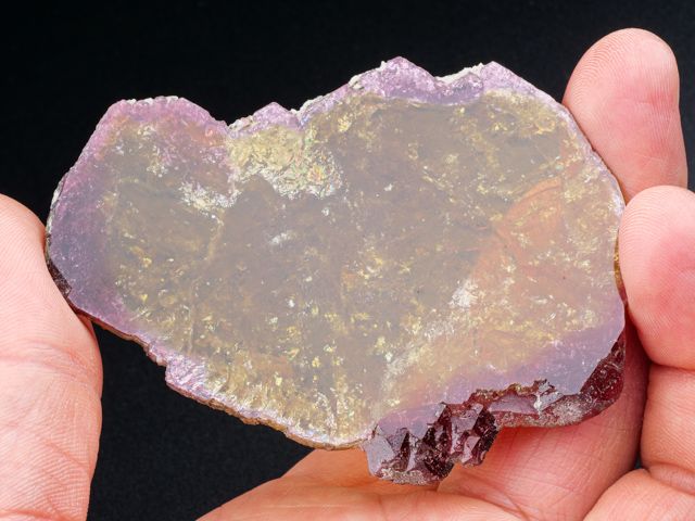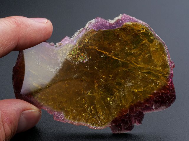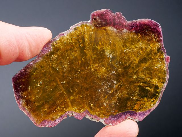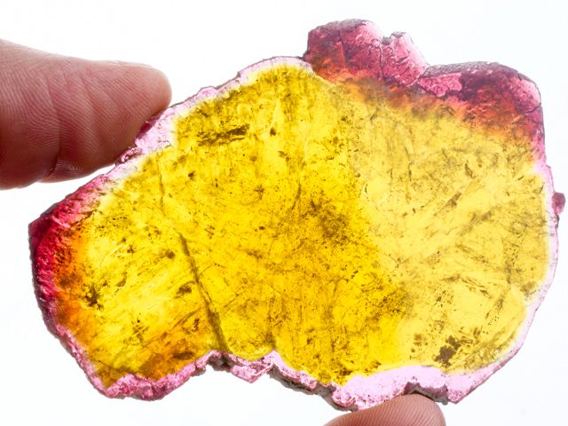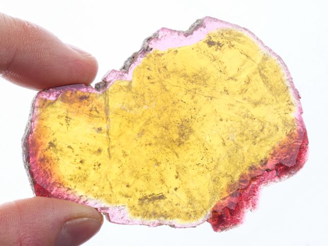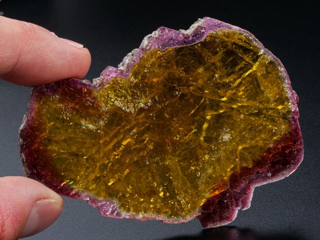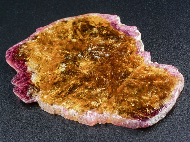 Barevně jedinečný řez ruským turmalínem (liddiocoatitem). Liddiocoatity jako je tento jsou světoznámě proslulé a vzhledem k jejich extravagantní barevnosti jsou využívány do jedinečných šperků. Placička může být i kvalitním zástupcem tohoto minerálu ve Vaší sbírce. Řez je leštěn z obou stran.