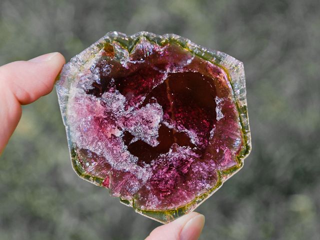 Barevně jedinečný řez madagaskarským turmalínem (liddiocoatitem). Madagaskarské liddiocoatity jsou světoznámě proslulé a vzhledem k jejich extravagantní barevnosti jsou využívány do jedinečných šperků. Placička může být i kvalitním zástupcem tohoto minerálu ve Vaší sbírce. Řez je leštěn z obou stran. Na leštěných plochách je několik vypadnutých drobných částeček turmalínu - toto se děje při leštění vzhledem ke struktuře krystalu. Řez má dvě velice drobná poškození u hran řezu (těžce pozorovatelné).