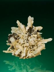 Sharp, brassy crystals of pyrrhotite are perched beautifully on clustered bursts of milky quartz crystals.Sharp, brassy crystals of pyrrhotite are perched beautifully on clustered bursts of milky quartz crystals (to 3,2 cm). You can also see some crystals of colorless fluorite and galena down amongst the quartzes.