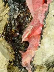 Medium size specimen - few sharp, gemmy, red color scalenohedral crystals of Rhodochrosite on matrix.This medium size specimen hosts a few sharp, gemmy, red color scalenohedral crystals of Rhodochrosite measuring up to 16 mm long on matrix. A nice sample of this well known material from Uchucchacua mine in Peru.