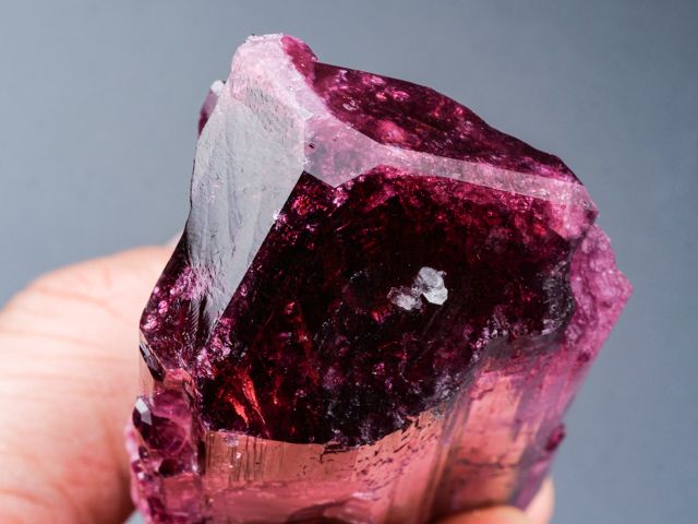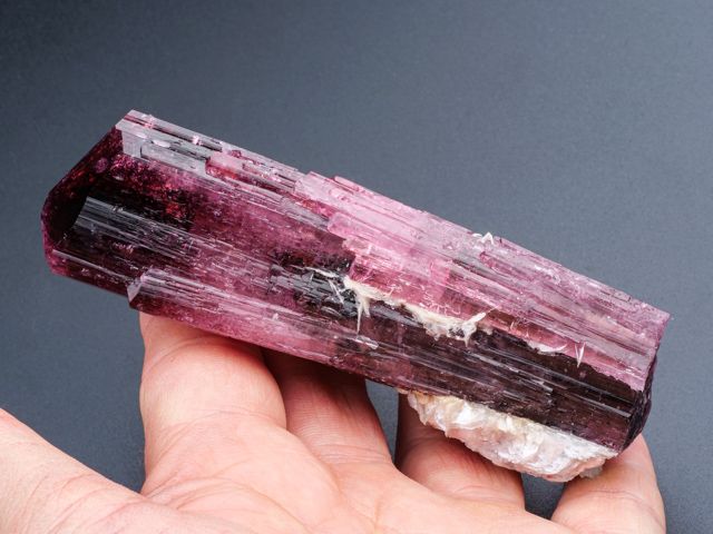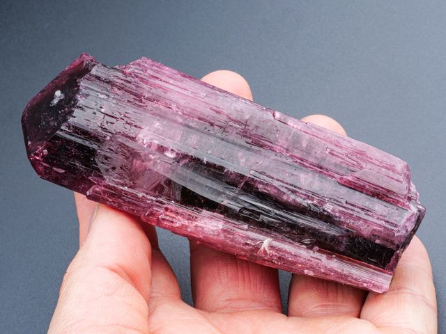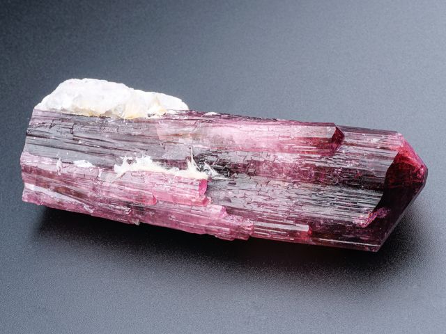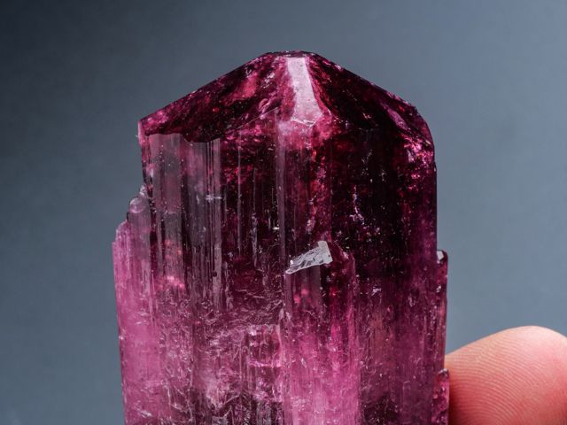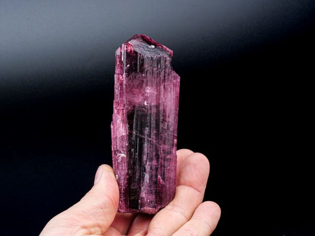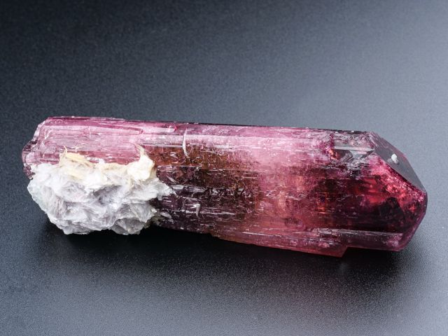 Elongated lustrous pink tourmaline crystal from Russia. The rubellite is very lustrous and terminated.