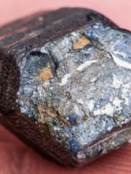 Attractive blue sapphire crystal, the colored gem variety of the mineral species corundum.Attractive blue sapphire crystal, the colored gem variety of the mineral species corundum, with hexagonal di-pyramidal form composed of stepped crystal faces. The sapphire has bands of deeper blue color alternating with pale zones. This was specimen recovered from an alluvial deposit and the edges show wear, but the crystal form is distinct.