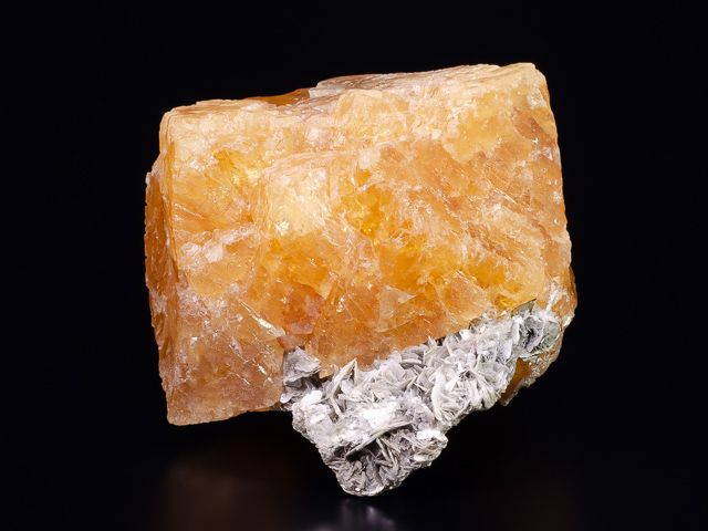 Rich orange, lustrous scheelite, 5.3 x 5.3 cm on the edges contacting matrix and up to 7.9 cm along pyramidal edge. Muscovite crystals envelop the scheelite on one side and the specimen is in top condition. Prior to the discovery of the Chinese scheelites, orange crystals of this size an magnitude were incredibly rare.