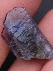 Lesklý krystal tanzanitu z lokality Merelani v Tanzánii. Krystal je ukončený a bez poškození. Krystaly této kvality jsou z této lokality ceněny i pro jejich barvoměnu - z čelní strany jsou krásně šedomodré, zatímco z boční strany jsou fialkově fialové. Krystal krásně vykazuje dichroismus a má hezký tvar!