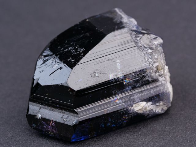Exkluzivní velký a lesklý krystal tanzanitu z lokality Merelani v Tanzánii. Krystal je ukončený (dokonce z obou stran!!!) a čistý. Krystaly této kvality jsou z této lokality ceněny i pro jejich barvoměnu - z čelní strany jsou krásně šedomodré, zatímco z boční strany jsou fialkově fialové. Drobné setření hrany (2.5x2.5 mm) je ve skutečnosti málo viditelné - zohledněno ve výsledné ceně. Odhadovaná váha brousitelné suroviny je 8-9 g.