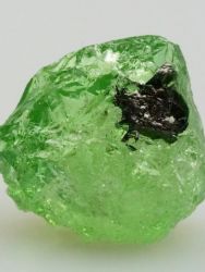 Lovely green of this Tsavorite Garnet gemstone crystal is made all the more vibrant by its translucency and lustrous surfaces. Quite large as far as Tsavorite crystals go, this specimen displays a nice geometric formation and minor occurrences of Graphite, providing a dramatic contrast of colors.