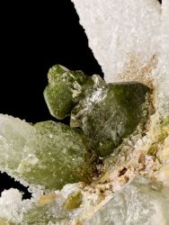 A very dynamic composition from Brumado, Brazil, featuring several crystals of bright green uvite on quartz and calcite.A very dynamic composition from Brumado, Brazil, featuring several crystals of bright green Uvite tourmaline both on and included within a several of crossed quartz and calcite crystals. Presents nicely for display as pictured.