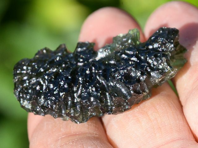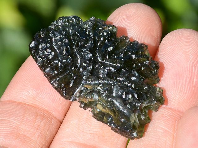Vltavín s úžasnou extra hrubou skulptací z lokality Malý Chlum. Vltavín má tvar půldisku, výrazně zelenou barvu a až netypickou výraznou skulptaci srovnatelnou s besednickou. Kámen z málo časté lokality vhodný do sbírky či šperku. Vltavín je bez poškození a je velmi lesklý.