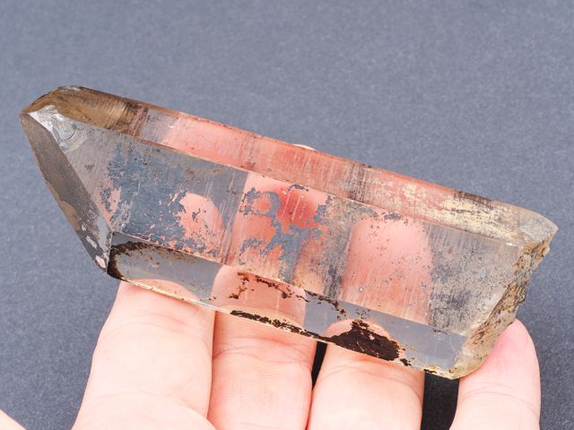 Zajímavý krystal přírodní záhnědy z ukrajinské lokality Volyň. Krystal je ukončený, lesklý a má přirozenou příjemně světle kouřovou barvu. Vysoká čistota dovoluje podobný materiál brousit - velké partie jsou drahokamové tzv. optický křemen - zde by to ale bylo velmi škoda jakkoliv s kamenem pracovat. Kámen má jen minimum velmi jemných poškození/oťuků - toto je zahrnuto do výsledné ceny. Toto jemné poškození neničí na první pohled dojem z nadstandardně efektního kamene.