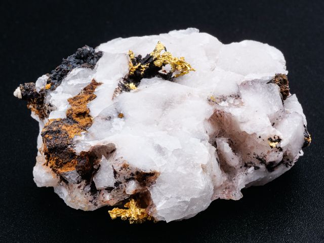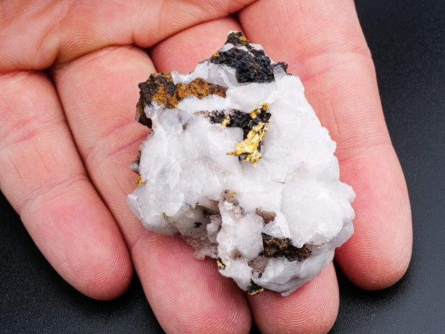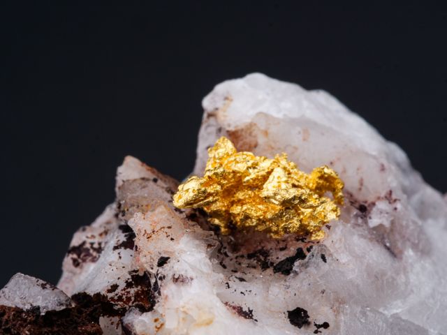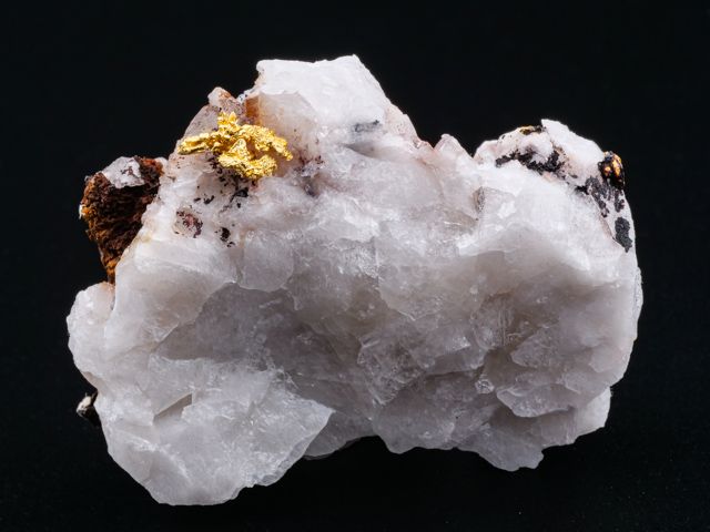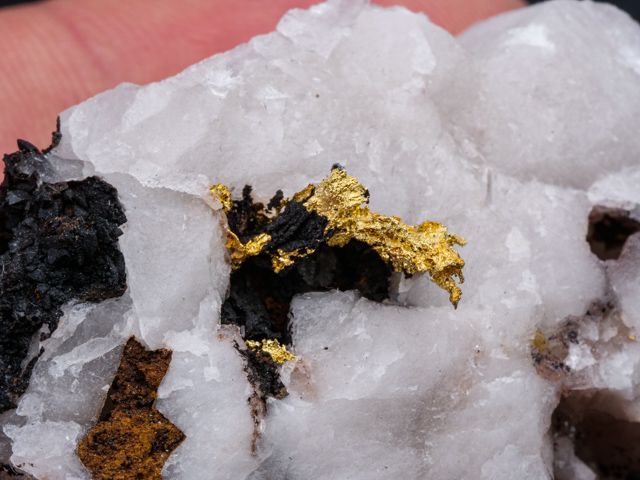 Native gold crystallized on quartz from the recent discovery in Morocco (first specimens revealed in late 2020).Native gold crystallized on quartz from the recent discovery in Morocco (first specimens revealed in late 2020). The main "feather" measures 10,6 mm.