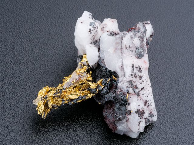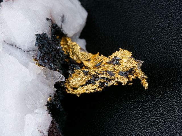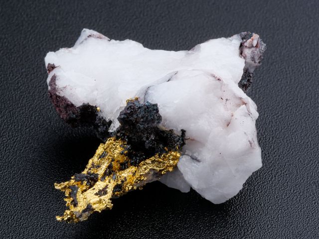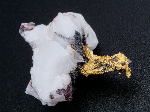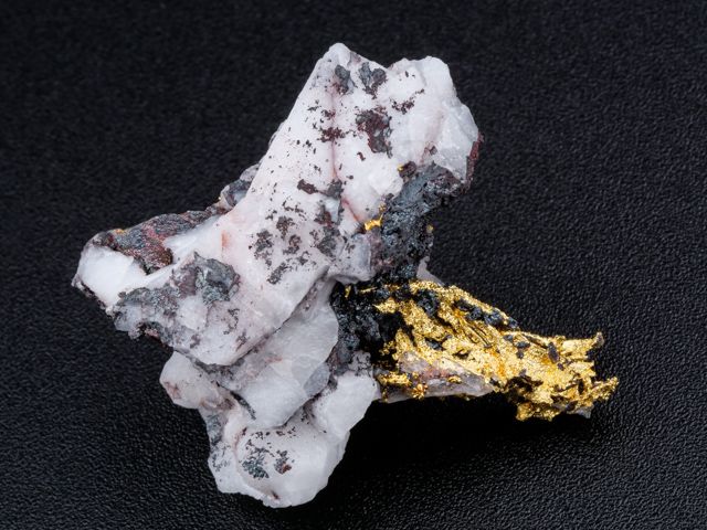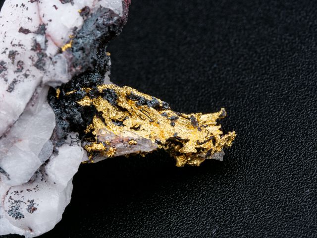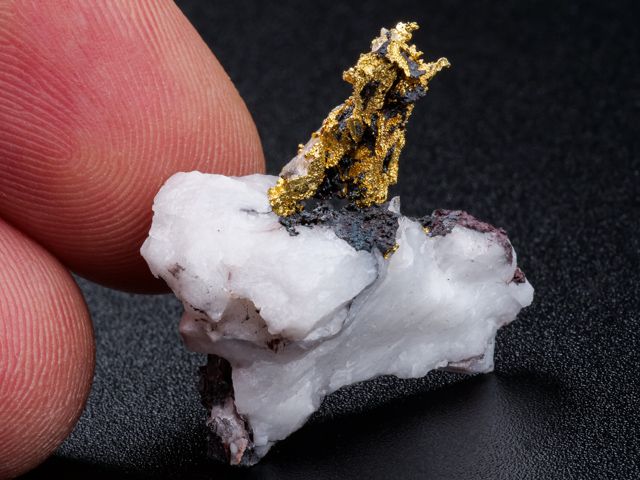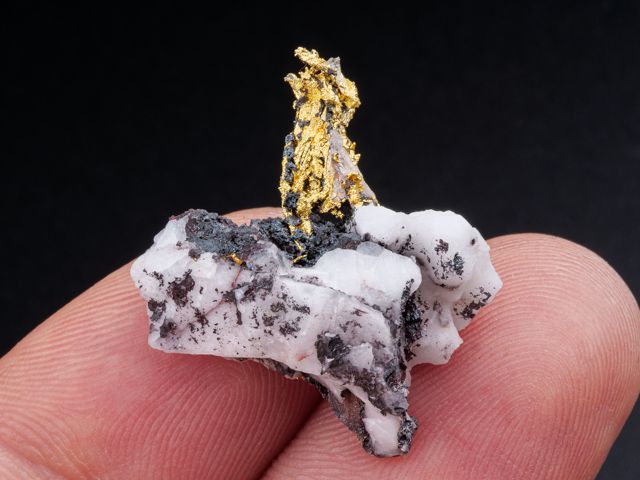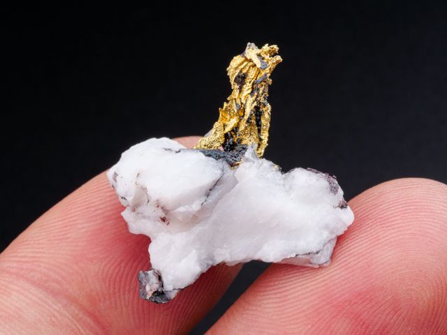 Překrásný vzorek ryzího zlata na křemeni z nového nálezu na lokalitě Aouint Ighoman v Maroku.Překrásný vzorek ryzího zlata na křemeni z nového nálezu na lokalitě Aouint Ighoman v Maroku. Seskupení lesklých krystalů zlata trčí z křemene. Velice estetický vzorek s velkým obsahem zlata.