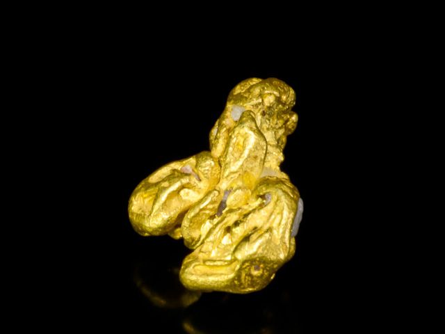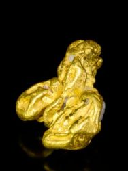 A colorful fine gold specimen from Ikabaru, Venezuela. It weighs a hefty 2.14 grams, so it feels like a solid nugget, although it clearly displays the skeletal crystallization that makes Venezuelan gold so unique.