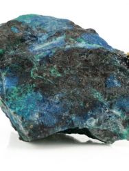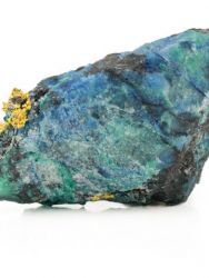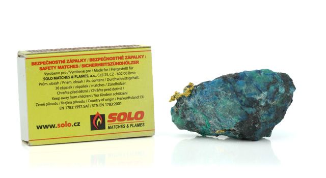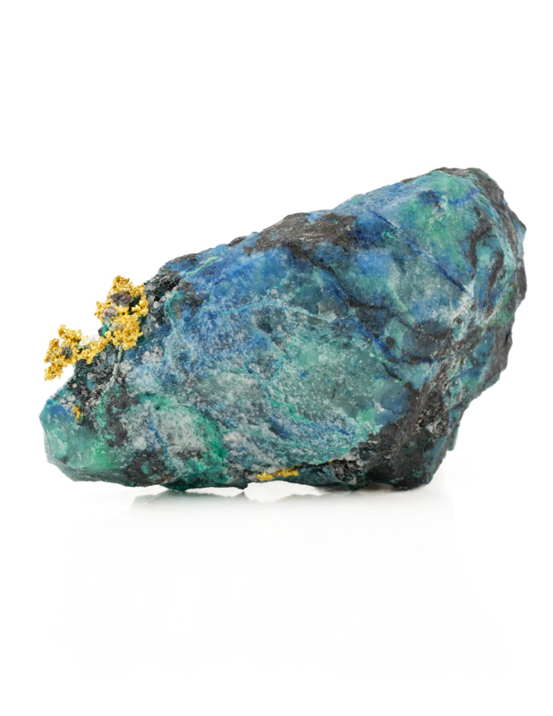 Very nice specimen of shattuckite loaded with leaf and vein Gold. The largest grain showing is 12 mm across. Nice piece, sits well.